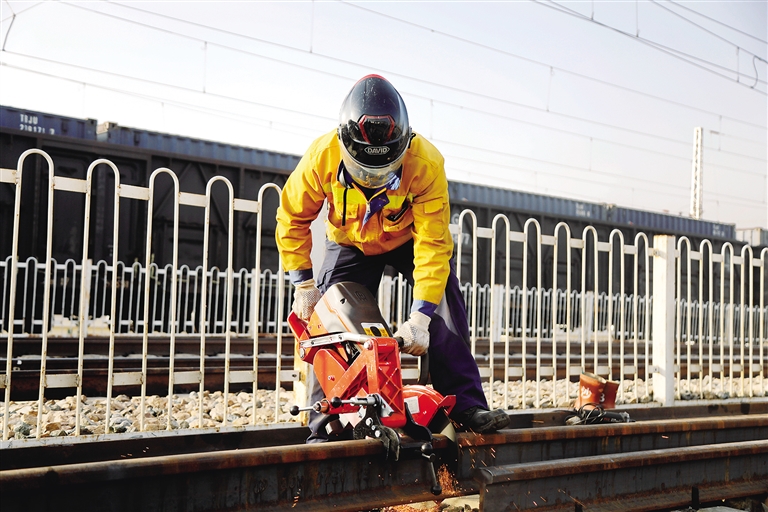 近日,呼和浩特工务段职工用锯轨机切割钢轨。唐包线沙良站是内蒙古煤炭资源和民生物资运输的重要铁路枢纽。由于钢轨强度和线路类型难以满足运输需求,急需升级换代,呼和浩特工务段利用三天时间,将这段1.2公里长的线路由50kg/m的有缝线路更换升级成60kg/m的无缝线路,进一步提高设备质量,确保运输安全。