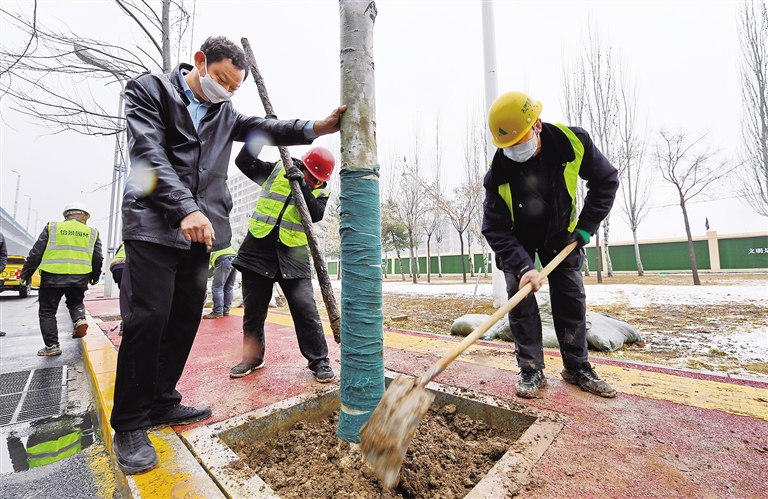 3月18日,工作人员在呼和浩特市海拉尔东街补植行道树。从3月10日起,呼和浩特市园林建设服务中心在全市范围开展行道树补植工作,共涉及全市3个公游园和167条道路,补植12400余株,主要品种为国槐、白蜡、白榆、串杨等。补植工作计划5月1日前完成。 本报记者 王磊 摄