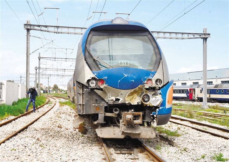 这是3月21日在突尼斯首都突尼斯市的事故现场拍摄的损毁列车。突尼斯首都突尼斯市南郊21日早晨发生两列列车相撞事故,造成90多人受伤。 新华社发
