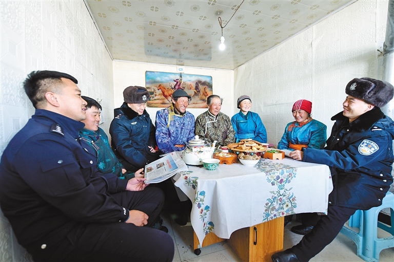 近日,锡林郭勒边境管理支队乌拉盖边境管理大队党员带着学习全国两会精神的心得,来到辖区牧民家,与他们一起讨论交流。