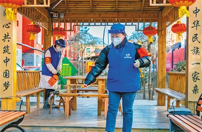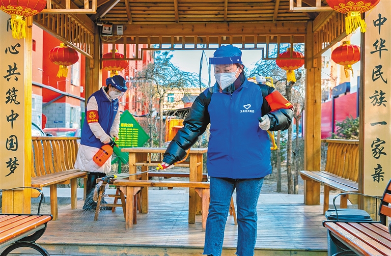 党员志愿者在社区进行清洁消杀。近日,呼和浩特市玉泉区党员志愿者主动担当,深入社区为居民提供力所能及的便民服务。本报记者 郝佳丽 通讯员 丁根厚 摄
