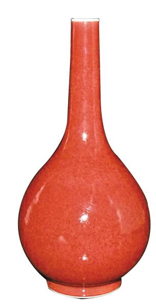 我珍藏着一件霁红釉长颈胆瓶,小口,长颈,圆腹,圈足。瓶高22厘米,口径2厘米,底径5厘米;胎体白中泛黄,内施青白釉,釉汁纯正凝厚;外壁通体施霁红釉,釉面细腻匀净。整件器物俏丽优雅,似一袭红衣的嫁娘,袅袅婷婷。