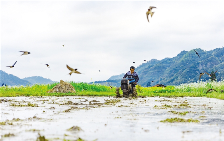 3月26日,在湖南省怀化市通道侗族自治县万佛山镇临口村,农民在田间耕作。随着天气回暖,各地农民抢抓农时进行生产,大江南北一派春日农忙景象。