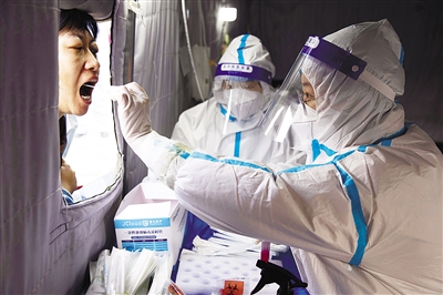 3月26日,在哈尔滨市道里区建国街道办事处核酸检测点,医务人员为市民进行核酸采样。为切实做好“外防输入、内防反弹”工作,尽快筛查出可能潜在的新冠病毒阳性感染者,彻底切断社区传播链条,3月26日、3月28日,哈尔滨市主城六区将连续开展两轮区域全员核酸检测。 新华社记者 张涛 摄