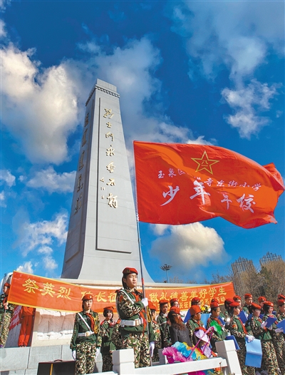 在纪念碑前,献一朵白菊、敬一个花圈,以无比崇敬的心情默哀致敬,表达对英烈的缅怀之情。