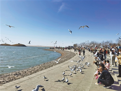 随着气温的回暖,成百上千的红嘴鸥沿着迁徙路线再度光临乌海湖。它们在碧波荡漾的湖面上逐水嬉戏、展翅翱翔,湖岸边,市民游客们争相与这些“水上精灵”互动合影。美好和谐的人鸟互动场景让乌海春天的气息更加浓郁。