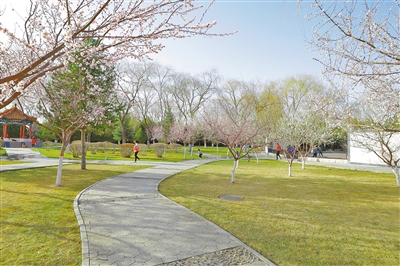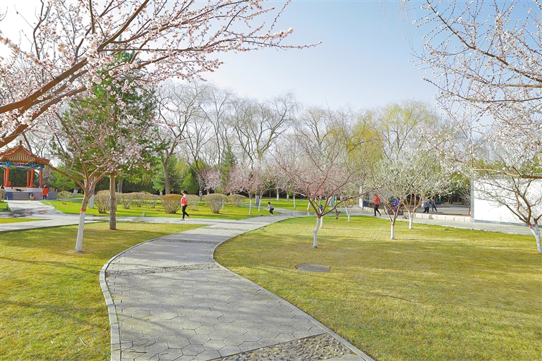乌审旗独贵龙公园广场上桃花盛开、绿意萌发