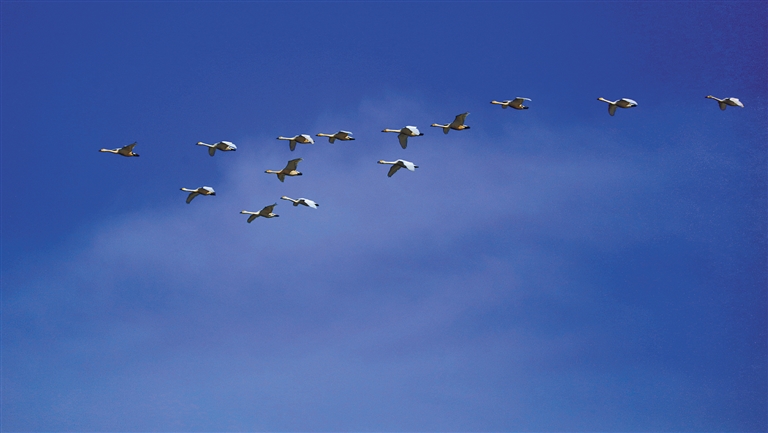 一群天鹅飞临巴彦淖尔市临河区黄河湿地。 文/图 张国玉