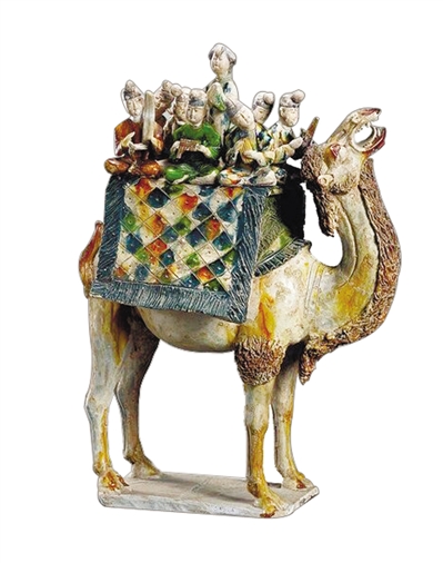 收藏于陕西省历史博物馆的唐三彩载乐骆驼俑,为盛唐时期三彩釉陶器,高58厘米,长41厘米。1959年出土于陕西省西安市西郊中堡村唐墓,为国家一级文物。