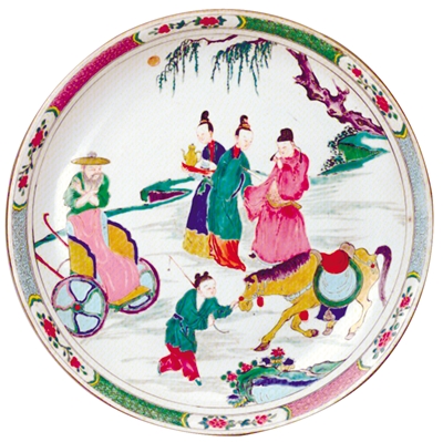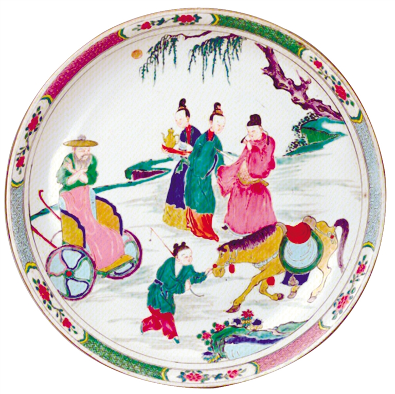 北京故宫博物院收藏着一件人物故事图盘,称得上是雍正时期粉彩瓷的代表作。盘高6厘米,口径37厘米,足径22厘米,制作规整,胎体较轻,胎质细腻,胎壁薄厚均匀。盘以粉彩为饰,盘心主题图案绘《西厢记》“长亭送别”片段。张生和崔莺莺站在柳树下话别,身后一侍女双手端酒壶,身前一童子执鞭牵马,一老者扶车等候,空间衬以山石、花卉、树木。画面明朗大方,人物构图巧妙,服装绮丽,神态逼真。画面通体以绿色为主,红、黄、蓝、紫、黑、金色点缀,色调鲜艳。