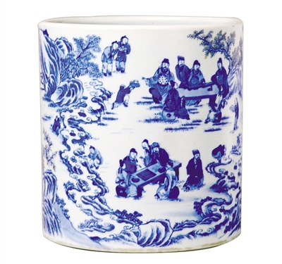 北京故宫博物院收藏着清代雍正时期的青花瓷“兰亭会”笔筒,直壁,圈足,口径19.8厘米,底径19.2厘米,高21厘米,制作考究,造型规整。据专家考证,此笔筒用的很可能是浙江产的上等青料,从高超的烧造技术及绘画技巧来看,当为景德镇御窑厂的高手所做。笔筒外壁通景绘《兰亭修褉图》,画面上青山绿水,松柏青翠,花草繁茂,溪中清流激湍,景色恬静宜人。所绘人物众多,神情各异,或细观青竹,或专心弈棋,或抚鬓聆听琴声,或展书谈古论今;数名童子或担酒抱瓮,或奉酒放觞,或驻足凝神听琴,形态活泼生动。