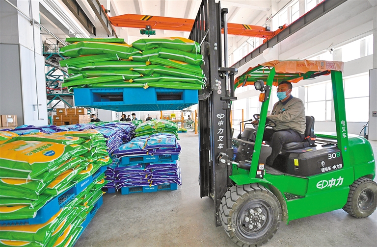 在内蒙古伊克塞胖嘟嘟生物科技有限公司的生产车间里,工人们戴着防护口罩忙碌着,自动化生产线也开足马力,投料、加工、分装、入库、检测……一袋袋饲料随即装车出厂,被运送到周边地区及全国各地,满足市场供给。