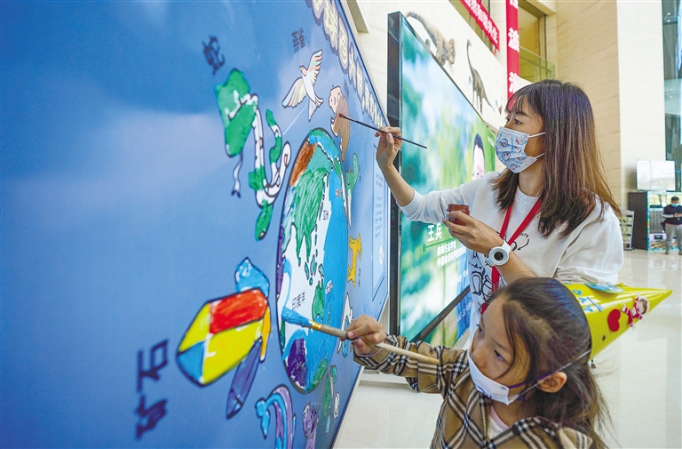 4月22日,呼和浩特市民在画板上绘画。当日是第53个世界地球日,自治区自然资源厅、内蒙古自然博物馆举办了“我为地球着色”“大自然在说话”等科普活动,呼吁更多的人参与到珍爱地球、保护环境的行动中。本报记者 王鹏 摄