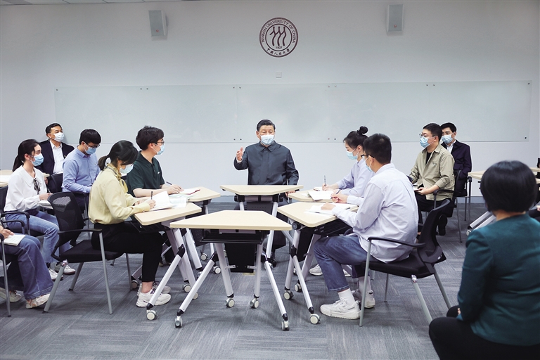 上午9时20分许,习近平在中国人民大学党委书记张东刚、校长刘伟陪同下,首先来到立德楼,观摩思政课智慧教室现场教学。习近平同青年学生一起就座,认真倾听并参与讨论,对学校立足自身优势,不断推进思政课教学改革创新,打造高精尖水平思政课的做法表示肯定。他强调,思想政治理论课能否在立德树人中发挥应有作用,关键看重视不重视、适应不适应、做得好不好。思政课的本质是讲道理,要注重方式方法,把道理讲深、讲透、讲活,老师要用心教,学生要用心悟,达到沟通心灵、启智润心、激扬斗志。青少年思想政治教育是一个接续的过程,要针对青少年成长的不同阶段,有针对性地开展思想政治教育。希望人民大学绵绵用力,久久为功,止于至善,为全国大中小学思政课教学提供更多“金课”。也鼓励各地高校积极开展与中小学思政课共建,共同推动大中小学思政课一体化建设。习近平勉励同学们坚定中国特色社会主义道路自信、理论自信、制度自信、文化自信,在全面建设社会主义现代化国家新征程中勇当开路先锋、争当事业闯将。