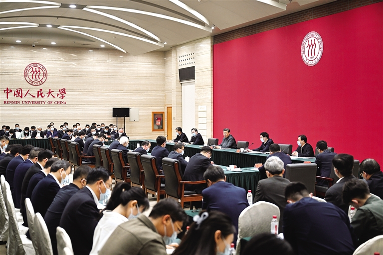 在认真听取大家发言后,习近平发表重要讲话。他强调,我国有独特的历史、独特的文化、独特的国情,建设中国特色、世界一流大学不能跟在别人后面依样画葫芦,简单以国外大学作为标准和模式,而是要扎根中国大地,走出一条建设中国特色、世界一流大学的新路。中国人民大学从陕北公学成立之初就鲜明提出要培养“革命的先锋队”,到新中国成立之初提出培养“万千建国干部”,到改革开放新时期提出培养“国民表率、社会栋梁”,再到新时代提出培养“复兴栋梁、强国先锋”,始终不变的是“为党育人、为国育才”,展现了“党办的大学让党放心、人民的大学不负人民”的精神品格。希望中国人民大学落实立德树人根本任务,传承红色基因,让听党话、跟党走的信念成为人大师生的自觉追求。