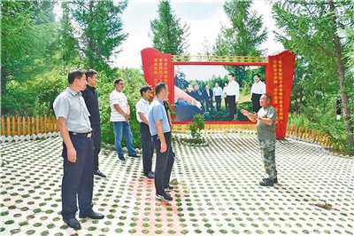 生态好了,来这里旅游的人也多了。一上午的时间,这里已经迎来了好几拨周边地区过来的游客。他们沿着小道,走到林场深处的一处平地。一张巨幅照片格外醒目,那是2019年7月15日,习近平总书记在林场与护林员交流的场景,两侧还配有总书记关于生态保护的殷切嘱托。如今总书记攀登过的这条护林小道已成为一个红色教育基地。