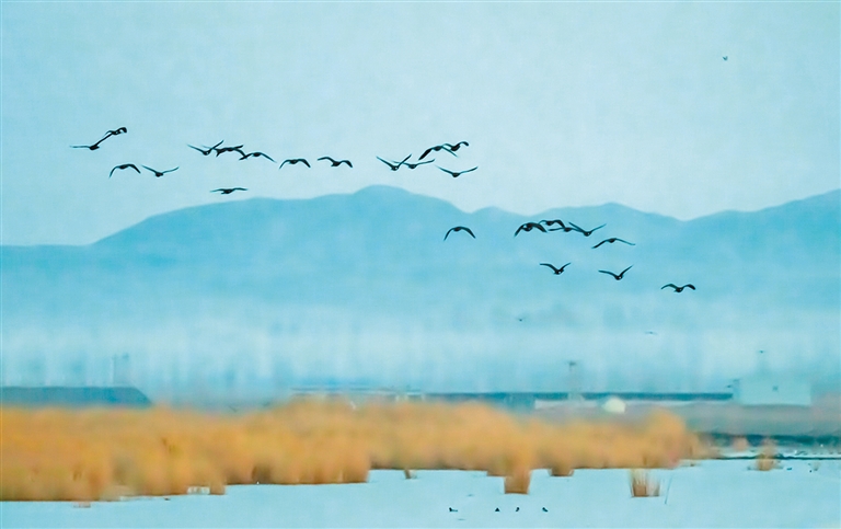 乌梁素海,薄雾缥缈,青山朦胧,群鸟展翅,静谧祥和。文/图 段忆河