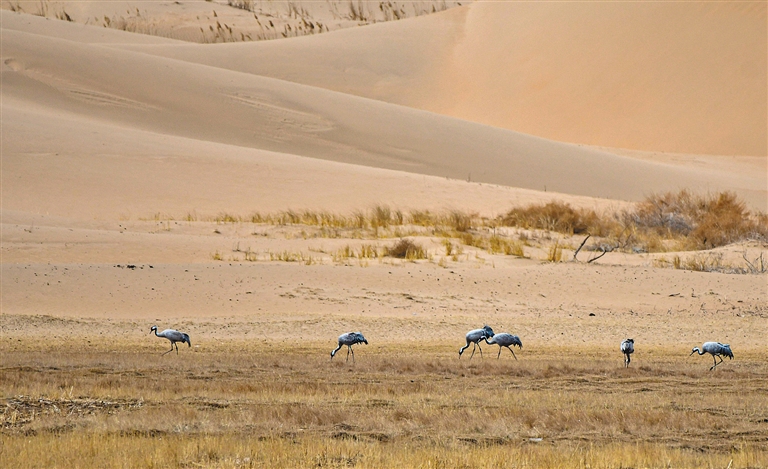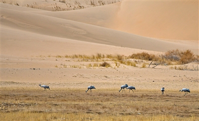 阿拉善左旗巴彦木仁苏木,灰鹤在乌兰布和沙漠边缘觅食。