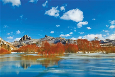 牙克石市巴林旅游区,群山覆雪,冰河初融,红柳欲燃,静美如画。