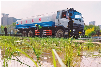 5月9日,园林工人在呼和浩特市金桥开发区金盛快速路桥下绿化带种植观赏狼尾草。近年来,呼和浩特市全力建设绿色化、智能化、人文化现代城市,全力提升居民的获得感、幸福感和安全感。本报记者 王晓博 摄