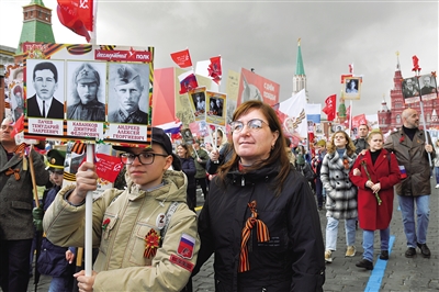 5月9日,在俄罗斯首都莫斯科,人们手持老战士照片参加“不朽军团”游行。当日,俄罗斯莫斯科、圣彼得堡等地举行“不朽军团”游行,纪念卫国战争胜利77周年。 新华社发