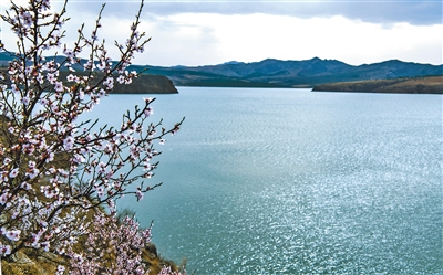 赤峰市三座店水库,群山连绵,碧水银波,杏花烂漫,美景如画。