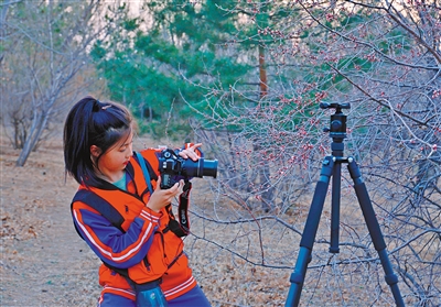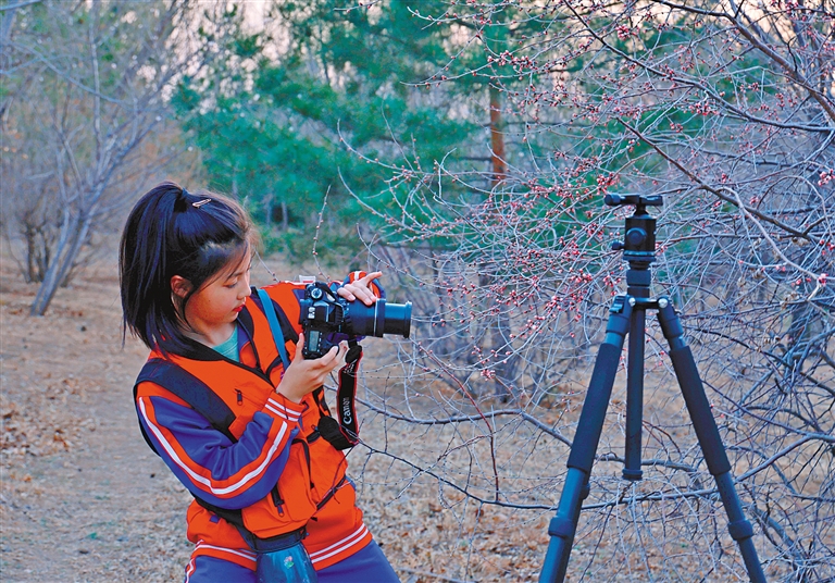 科右前旗植物园,一名小学生在摄影老师的指导下,拍摄桃花,俨然摄影师。文/图 苏世君 |