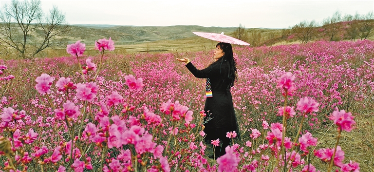 阿荣旗音河乡五五村,一位游客在杜鹃坡赏花。
