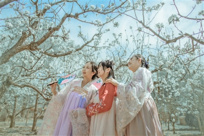 巴彦淖尔市临河区,几位女子在梨花丛中留影。文/图 段忆河 |