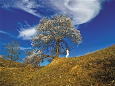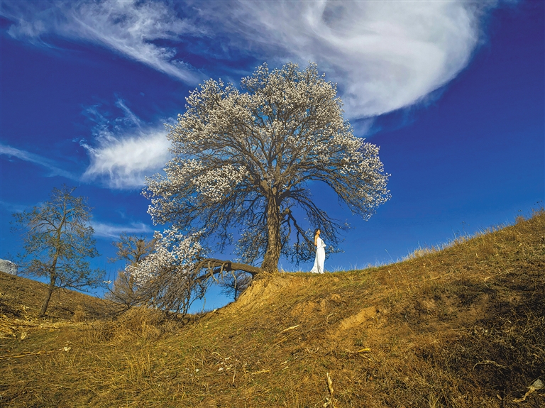 一位女子在和林县台格斗村古杏树下拍摄写真。文/图 崔巍 |