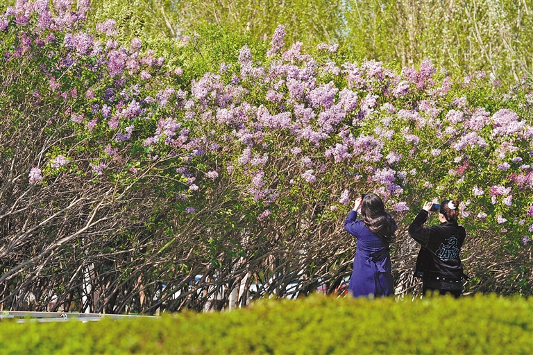 哈尔滨丁香公园,市民在观赏拍摄丁香花。