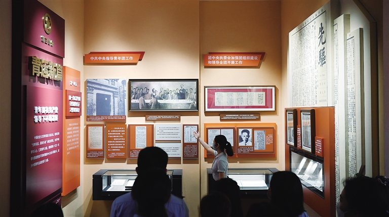 5月12日,讲解员在团一大纪念馆内为参观人员讲解。当日,团一大纪念馆在广州建成开放。纪念馆紧扣中国共产党领导下的中国社会主义青年团创建主题,地上地下约1200平方米的展览面积,展示了党亲手缔造青年团、指导青年团创建的历程。200余幅图片、70余件实物、6组雕塑、10余个历史视频,如实地反映了团历史上的重大事件、重要人物和重要会议。