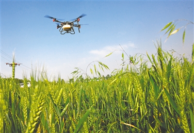 在青岛市平度田庄镇幸福庄村,植保无人机在进行田间作业(5月17日摄,无人机照片)。眼下正值山东小麦灌浆生长关键期,各地组织“飞防”专业技术人员,利用植保无人机对小麦开展“一喷三防”喷洒作业,为夏粮丰收提供支持和保障。 新华社记者 李紫恒 摄
