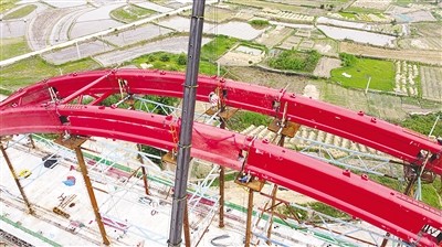 这是5月18日拍摄的中铁十一局池黄铁路白沙铺特大桥系杆拱合龙施工现场(无人机照片)。当日,由皖赣铁路安徽公司承建、中铁十一局施工的池(州)黄(山)铁路白沙铺特大桥128米系杆拱顺利合龙,为后续工程施工提供了保障。池黄铁路全长约125公里,设计时速350公里,是武(汉)杭(州)快速铁路通道的重要组成部分。 新华社发