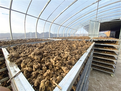 在内蒙古九禾农业科技发展有限公司建设的兴安盟“道地药材”农村产业融合发展示范园内,已经起收的400亩成熟苍术经过粗加工、破碎、人工上盘、烘干等程序,被均匀地摆放在架子上,预计市场价值在800万元以上。