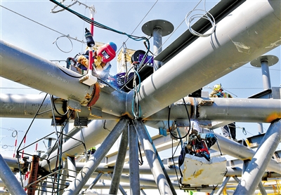 5月19日,呼和浩特新机场施工现场一派繁忙,工人们正在紧张施工。当日,据中建八局施工单位负责人介绍,呼和浩特新机场项目航站楼主体混凝土结构已经施工完成,工程建设已进入主体钢结构施工阶段,二次结构、机电安装穿插施工。停车楼、交通换乘中心、楼前高架桥及轨道交通预留工程等区域,正处于桩基施工阶段。本报记者 马建荃 摄