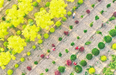 5月20日,农民在河北省石家庄市栾城区栾城镇北石碑村绿之栾合作社苗木基地里劳作(无人机照片)。小满节气将至,全国各地农民抢抓农时,田间地头一派繁忙景象。 新华社发