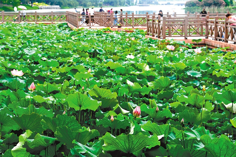 初夏时节,广西南宁市南湖公园荷塘里荷花盛开,鸟儿嬉戏,蜜蜂翩跹,一派生机勃勃的景象。 新华社记者 周华 摄