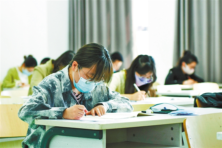 5月21日,考生在内蒙古财经大学考点参加事业单位考试。当天,内蒙古自治区2022年上半年直属事业单位公开招聘分类考试在全区12个盟市同步开考。此次考试是自治区全力稳就业保就业的重要举措,涉及485个事业单位,计划招聘2619人,报名参考人数达9.1万余人,高校毕业生占95%。 见习记者 杨林枝 摄