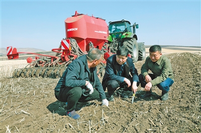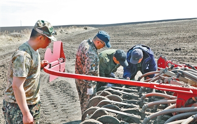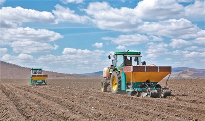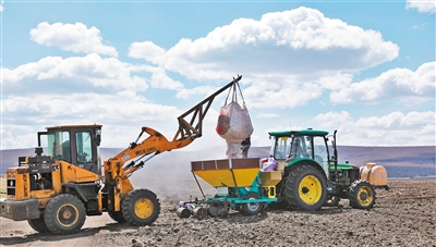 5月24日,呼伦贝尔农垦集团免渡河农牧场马铃薯种植基地机声隆隆,大型播种机械在田间地头加肥、播种。