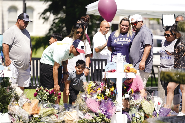 5月27日,在美国得克萨斯州南部尤瓦尔迪市的城市广场,市民哀悼枪击事件遇害者。美国得克萨斯州南部尤瓦尔迪市5月24日发生恶性校园枪击事件,造成至少19名儿童和2名教师死亡。这是美国近十年来遇害人数最多的一起校园枪击事件。 新华社记者 吴晓凌 摄