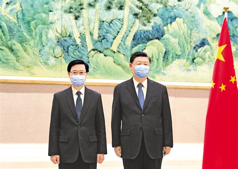 习近平强调,今年适逢香港回归祖国25周年。25年来,尽管经历了许多风雨挑战,但“一国两制”在香港的实践取得了举世公认的成功。中央全面准确贯彻“一国两制”方针的决心从没有动摇,更不会改变。在中央政府、香港特别行政区政府和社会各界的共同努力下,香港已实现由乱到治的重大转折,正处在由治及兴的关键时期。我相信,新一届特别行政区政府施政一定会展现新气象,香港发展一定会谱写新篇章。