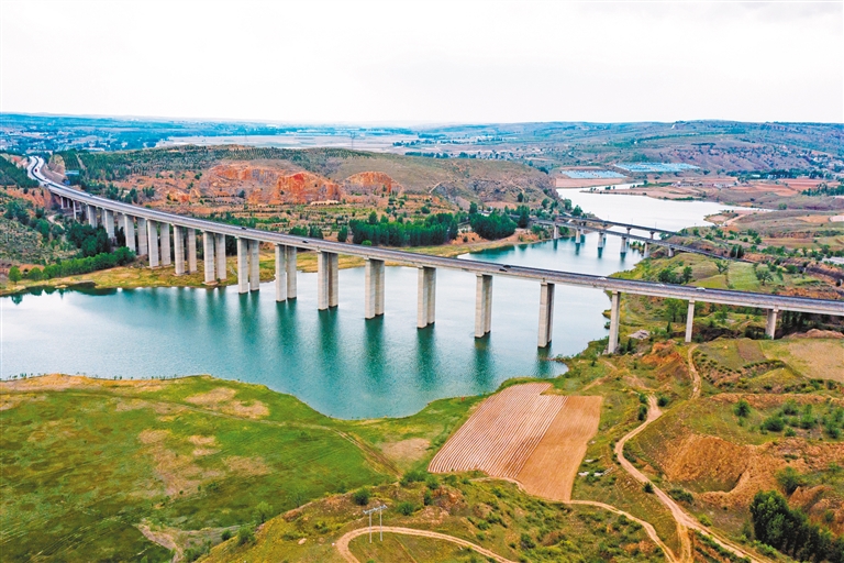 初夏时节,高空俯瞰呼和浩特市清水河县高茂泉窑村。大桥从一片片农田上空飞跨而过,描绘出美丽的夏日村庄景色。