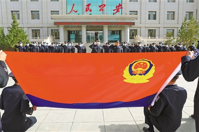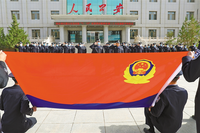 近日,在阿拉善盟阿拉善右旗公安局组织的“喜迎二十大 忠诚保平安”主题活动中,全体民警辅警警容严整、精神饱满地向警旗宣誓,表达坚持“十六字”总要求,积极履行新时代使命任务的决心。本报记者 陈春艳 摄