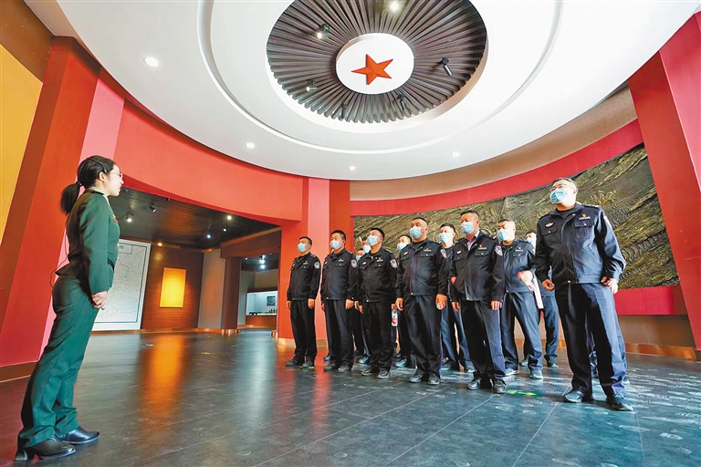 近日,鄂尔多斯出入境边防检查站组织党员民警赴鄂托克前旗城川民族干部学院开展“走进红色城川 重温革命精神”主题教育实践活动。全体党员民警通过重温入党誓词等形式,缅怀革命先烈,传承红色精神。本报记者 安寅东 摄