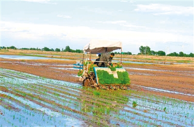 奈曼旗白音他拉苏木希勃图嘎查沙地稻田,护农种植专业合作社农机人员正在插秧。文/图 鲍明全