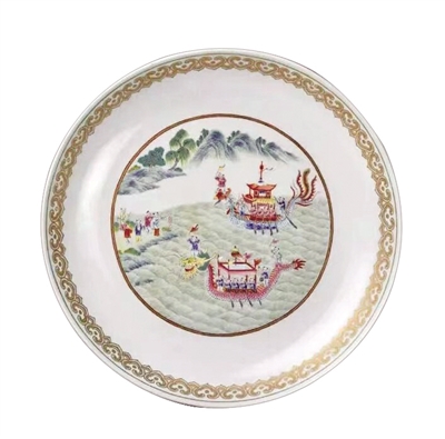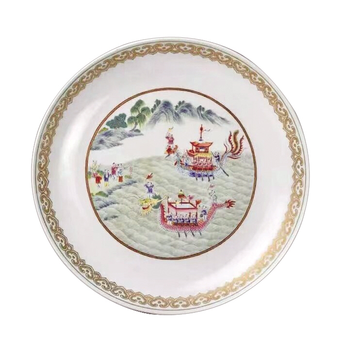 故宫博物院珍藏的这只粉彩赛龙舟、凤舟图盘,是清道光时期瓷器,高5.4厘米,口径28.5厘米,足径17.8厘米。盘敞口、浅弧壁、圈足,内外粉彩装饰。内壁近口沿处以金彩描绘如意头纹,内底以粉彩描绘赛龙舟、凤舟图。水中几个孩童分别奋力划着一只龙舟和一只凤舟。龙舟、凤舟船头各立一孩童,均手执令旗呼号指挥,龙舟尾部一孩童还鸣锣助威。2只船上的其余孩童奋力划桨。岸上站立5位小童,有燃放鞭炮的、有呐喊的,好不热闹。外壁以粉彩描绘结带折枝花、杂宝纹,杂宝有书画、笔锭、方胜、如意、珊瑚、犀角、铜钱等。外底署矾红彩楷体“慎德堂制”四字双行款。