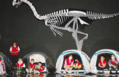 近日,内蒙古博物院推出《博物馆奇妙夜》活动。活动邀请六组家庭的家长和小朋友们夜探博物馆,一起走进《远古世界》,在恐龙脚下安营扎寨,躺在帐篷里看恐龙,在博物馆共度美好亲子时光。本报记者 王磊 摄