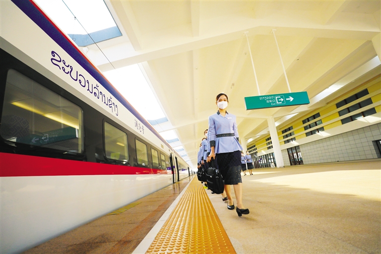 5月24日,在老挝中老铁路万象站,老中铁路有限公司的乘务员在“澜沧号”动车组外准备迎接乘客。2021年12月3日,中老铁路全线建成通车,截至6月3日运营已满半年。半年间,这条铁路带动了客流、物流,为沿线国家和地区创造出新的发展机遇。中老铁路全线采用中国技术标准、使用中国设备并与中国铁路网直接连通,成为中国标准造福世界的亮眼名片。 新华社发