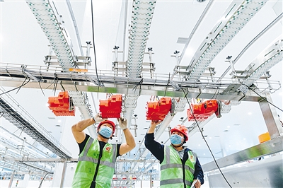 6月4日,工人们在伊利现代智慧健康谷液态奶全球智造标杆基地项目生产线上进行设备调试。该项目位于伊利现代智慧健康谷核心区,总投资50亿元,是全球单体规模最大、自动化水平最高、技术装备最先进、零碳绿色、5A级沉浸体验的全球智能制造标杆项目,计划6月中旬投入运行。本报记者 王晓博 摄